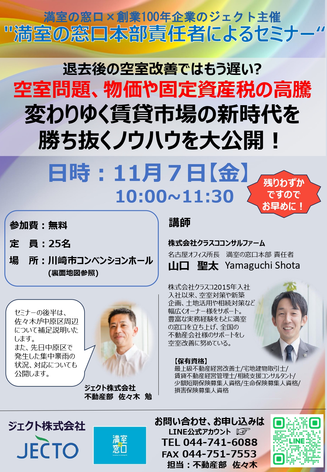 空室問題、物価や固定資産税の高騰、変わりゆく賃貸市場の新時代を勝ち抜くノウハウを大公開します。 後半には、先月の集中豪雨についてもお話しさせていただきます。 続々と予約が入ってきておりますが、若干の空きがございます。まもなく満席となりますのでお早めのご予約をお待ちしております